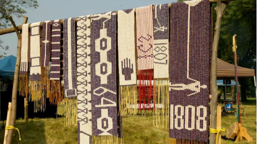 Iroquois Chiefs from the Six Nations Reserve reading Wampum belts in Brantford, Ontario.